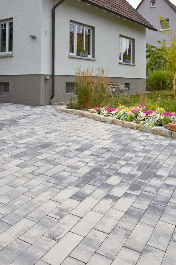 Hier sehen Sie die Einfahrt eines modernen Hauses, gestaltet mit Marea-Pflastersteinen in verschiedenen Grautönen. Die Fläche wirkt harmonisch, ruhig und zugleich lebendig. Die klaren Linien des Pflasters und die Begrenzungen aus Beton und Naturstein ordnen den Raum und setzen elegante Akzente. Es lässt sich gut vorstellen, wie angenehm es ist, hier zu gehen oder mit dem Auto einzufahren.