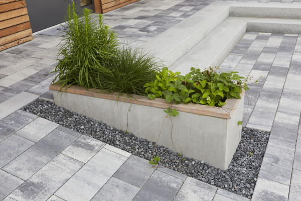 In der Mitte steht ein Pflanzkübel aus Sichtbeton mit einer Holzabdeckung. Darin wachsen Gräser und grüne Pflanzen, die dem Bereich Farbe und Leben geben. Rund um den Kübel liegt grauer Zierkies, der die Fläche klar abgrenzt und ordentlich aussehen lässt. Im Hintergrund führen breite Treppenstufen aus hellem Stein auf eine höhere Ebene, die zum Hauseingang führt. Die Kombination aus Pflastersteinen, Beton, Holz und Pflanzen schafft einen modernen, gepflegten Gesamteindruck.