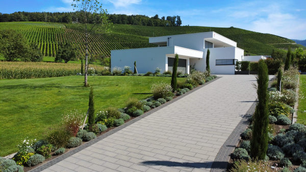 Die Einfahrt ist mit Ecologico Pflastersteinen gestaltet und bildet zusammen mit Haus, Beeten und Hügel ein stimmiges Gesamtbild. Der grüne Rasen und die weite Umgebung mit den Weinbergen im Hintergrund vermitteln Ruhe und Weite. Jeder Bereich wirkt durchdacht und einladend. So können Sie den Garten bewusst erleben und die harmonische Atmosphäre jeden Tag genießen.