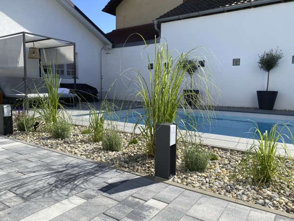 Der Außenbereich wird von einem Weg aus Marea Pflastersteinen in verschiedenen Grau- und Beigetönen geprägt. Die rechteckigen Steine sind sauber verlegt und wirken modern und elegant. Schwimmbad-Randplatten säumen den Weg und betonen die Kanten, wodurch die Struktur besonders klar und stilvoll wirkt.