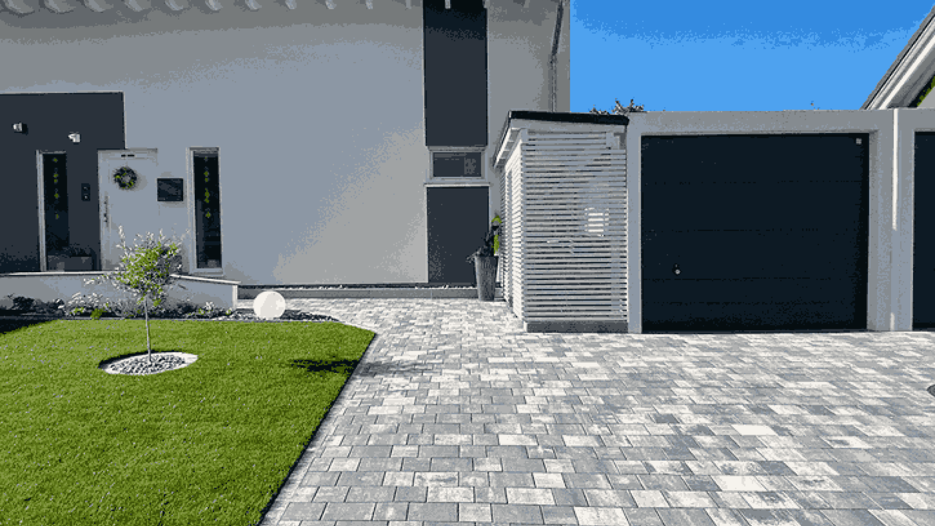 Vor Ihnen liegt eine breite Einfahrt, die mit unseren Marea Pflastersteinen in verschiedenen Grau- und Beigetönen verlegt ist. Die rechteckigen Steine wirken modern und sind sauber verlegt, während dunklere Randsteine elegante Akzente setzen. So wirkt die Einfahrt stilvoll und lebendig.