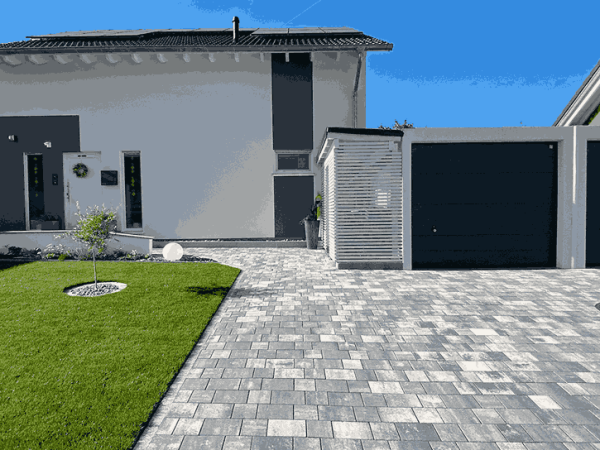 Vor dem Haus liegt eine großzügige Pflasterfläche, die viel Platz bietet und den Eingangsbereich ordentlich wirken lässt. Die Trisano Öko-Pflastersteine in Petrol setzen dezente Grau- und Blautöne ein, die Ruhe und Lebendigkeit zugleich vermitteln. Das moderne Pflaster passt sich harmonisch der grünen Umgebung an und sorgt für ein gepflegtes Gesamtbild.