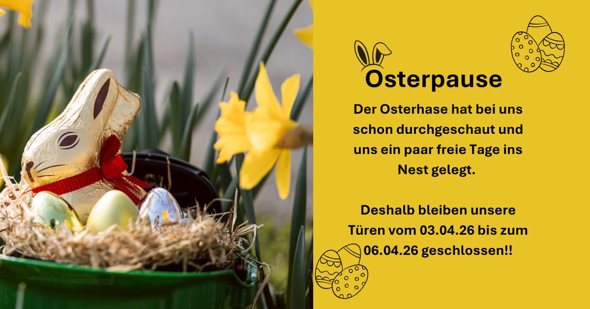 Wir haben vom 03.04.2026 bis zum 06.04.2026 geschlossen.