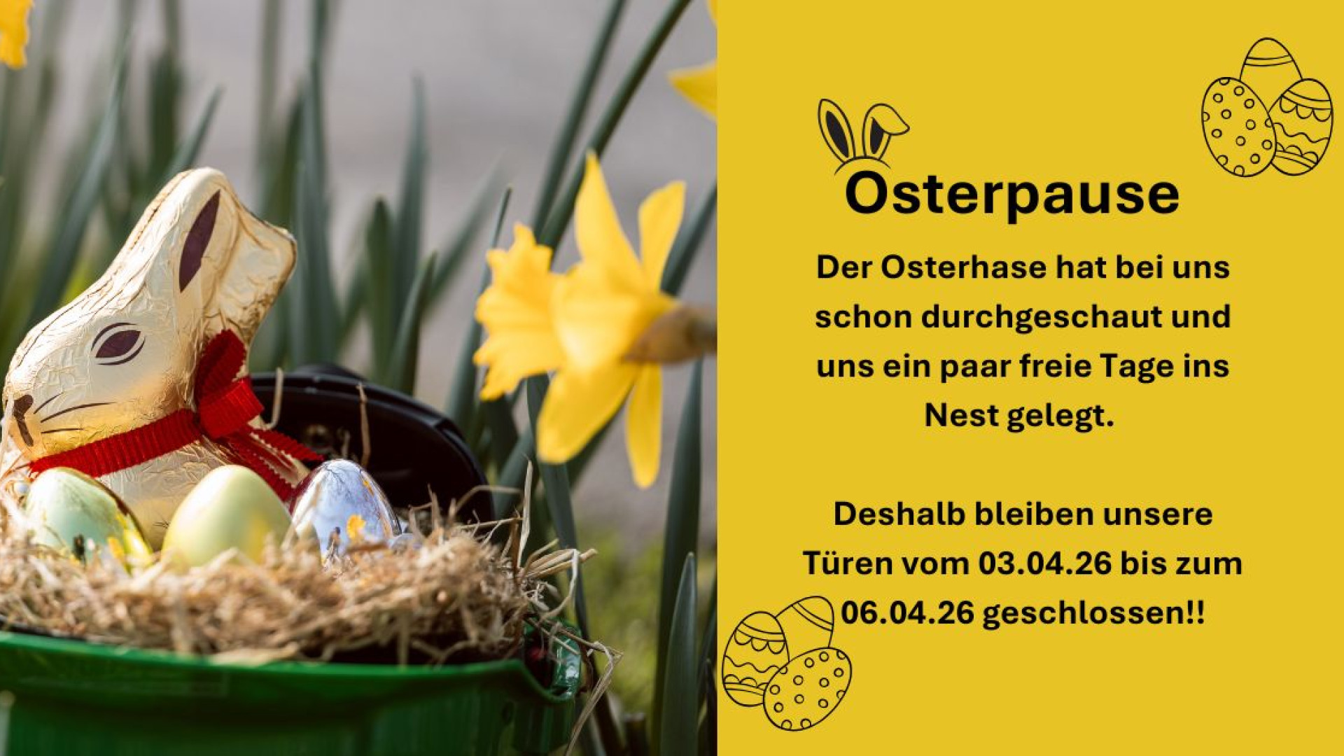 Bitte beachtet unsere Schließzeiten über Ostern: